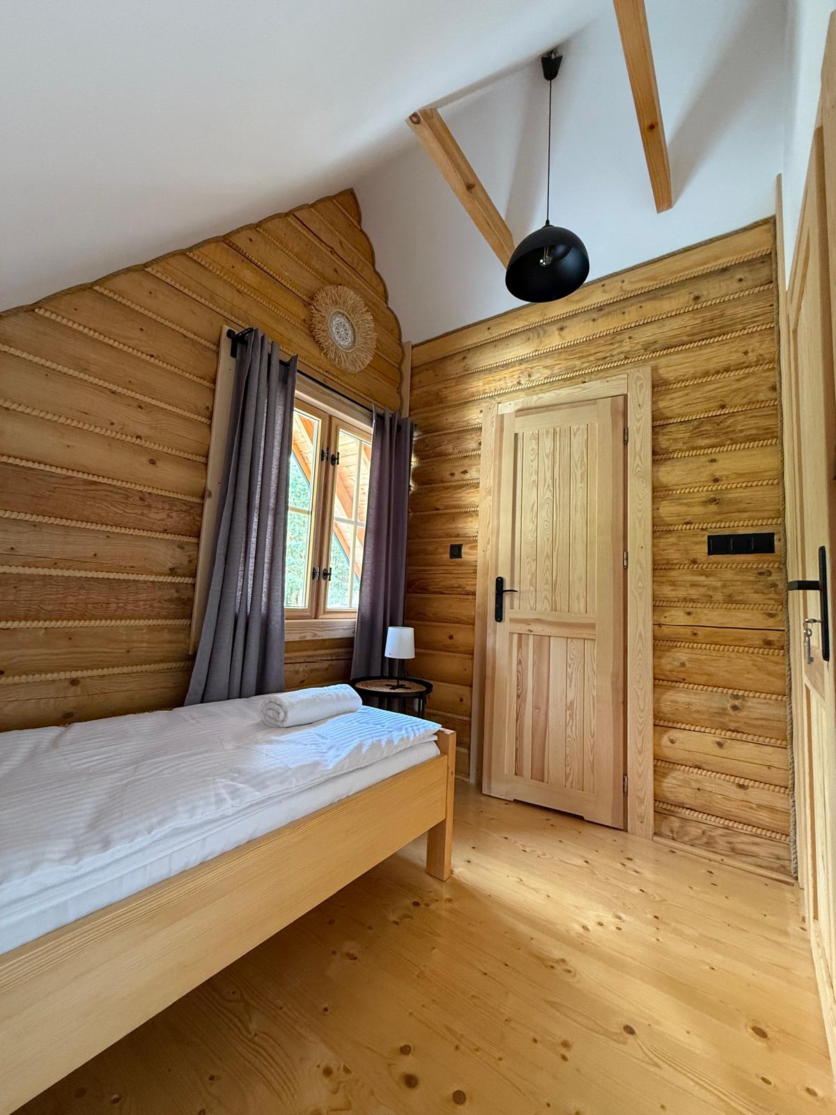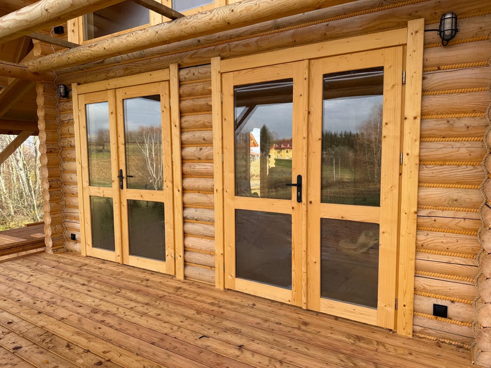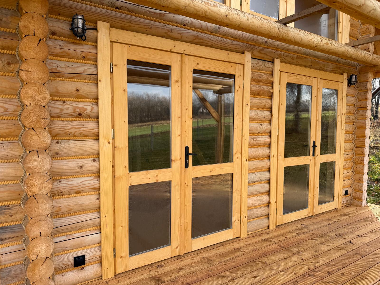 Ściany z litych, pełnych bali drewnianych o średnicy 180 mm,