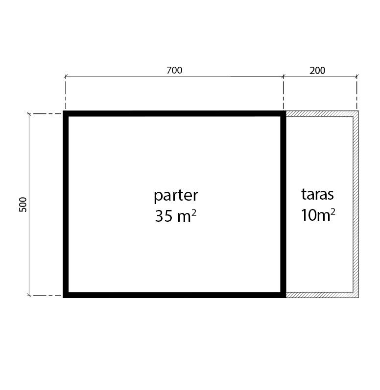 Parter o wymiarach 35 m2 gwarantuje wystarczającą przestrzeń do realizacji własnego projektu aranżacyjnego. Pierwsza kondygnacja mieści w sobie strefę wypoczynkowa dla całej rodziny oraz kuchnie z jadalnią. Państwo może postanowić podzielić parter na pokoje lub zdecydować się na otwartą przestrzeń. Dzięki możliwości modyfikacji, projekt zostanie dokładnie dostosowany do potrzeb przyszłych właścicieli.