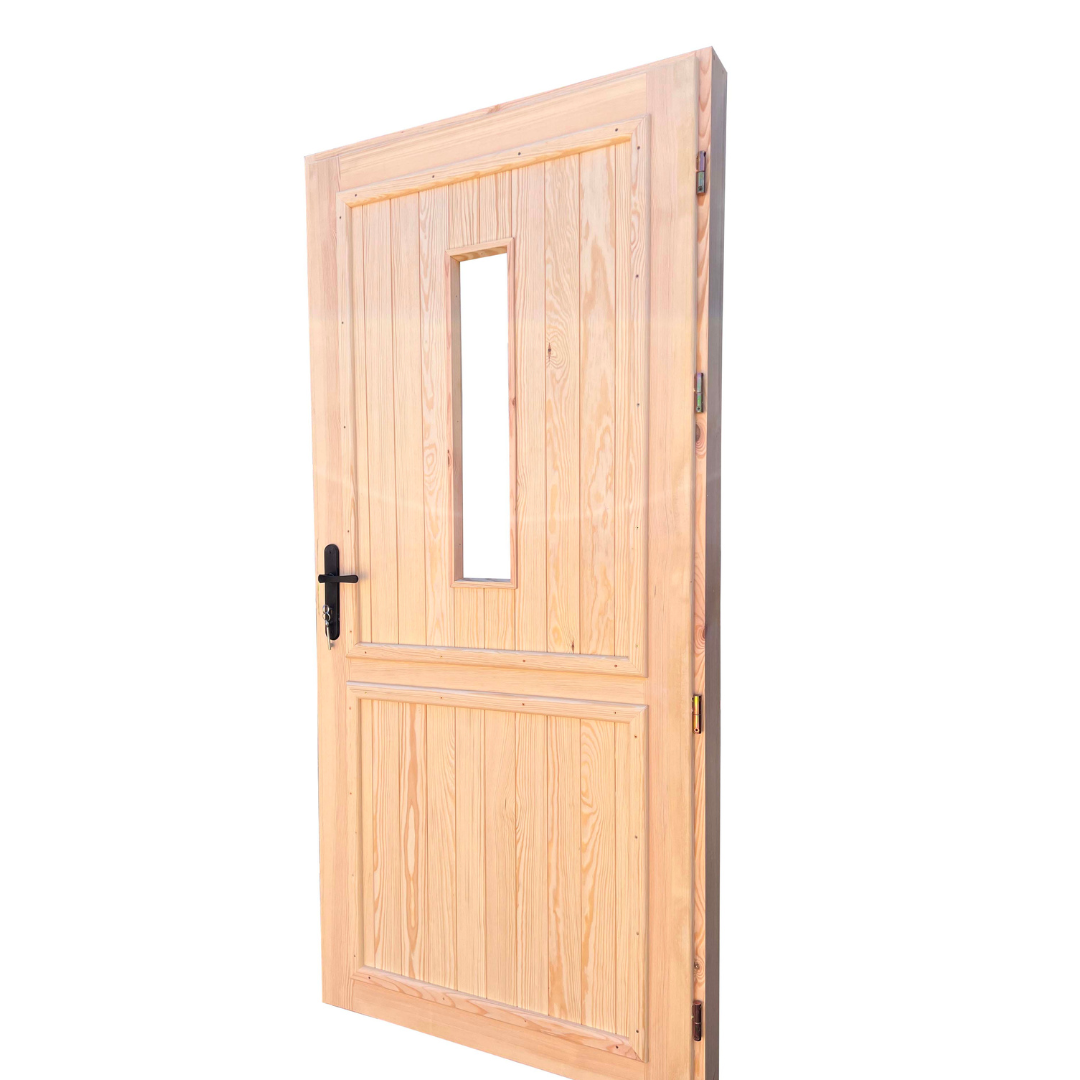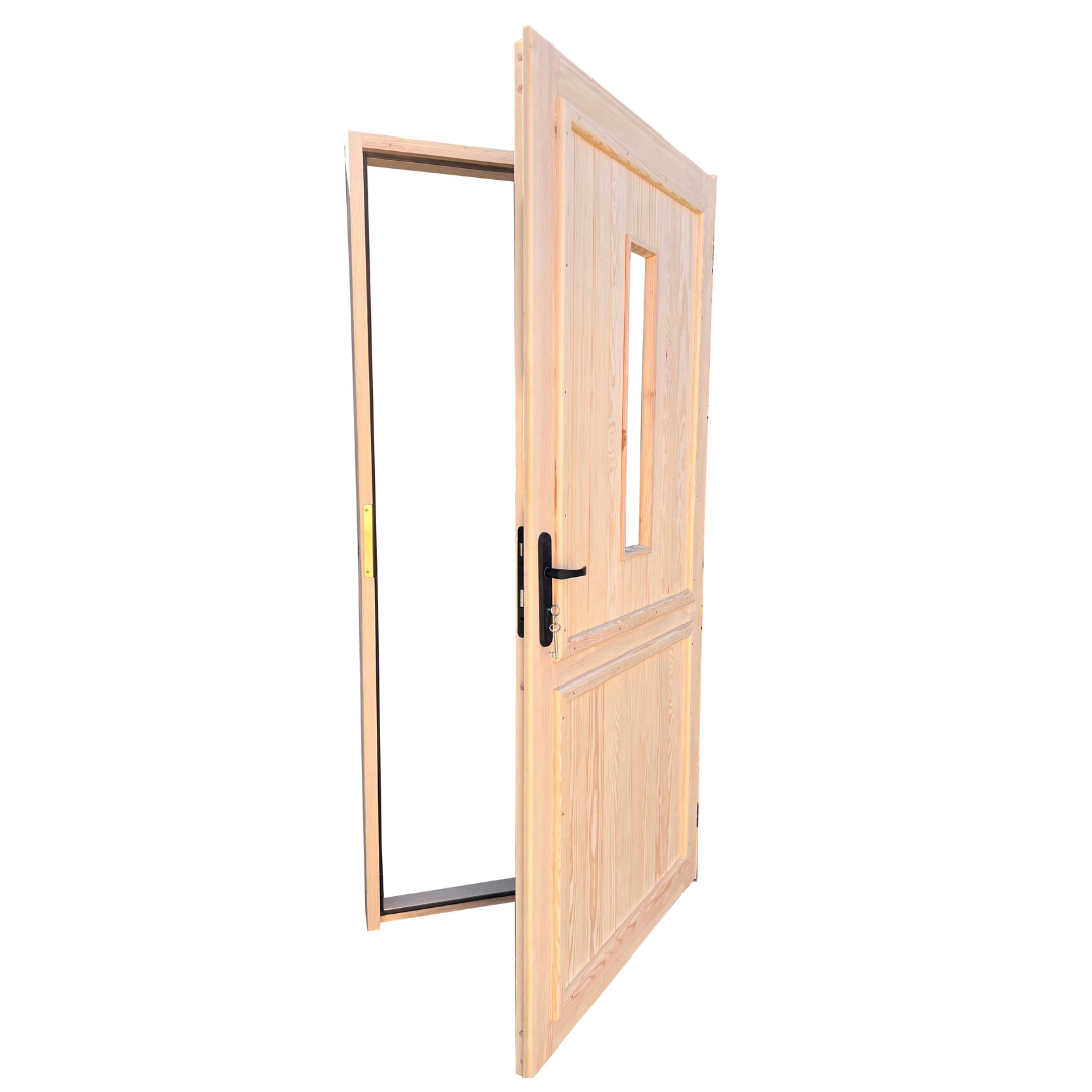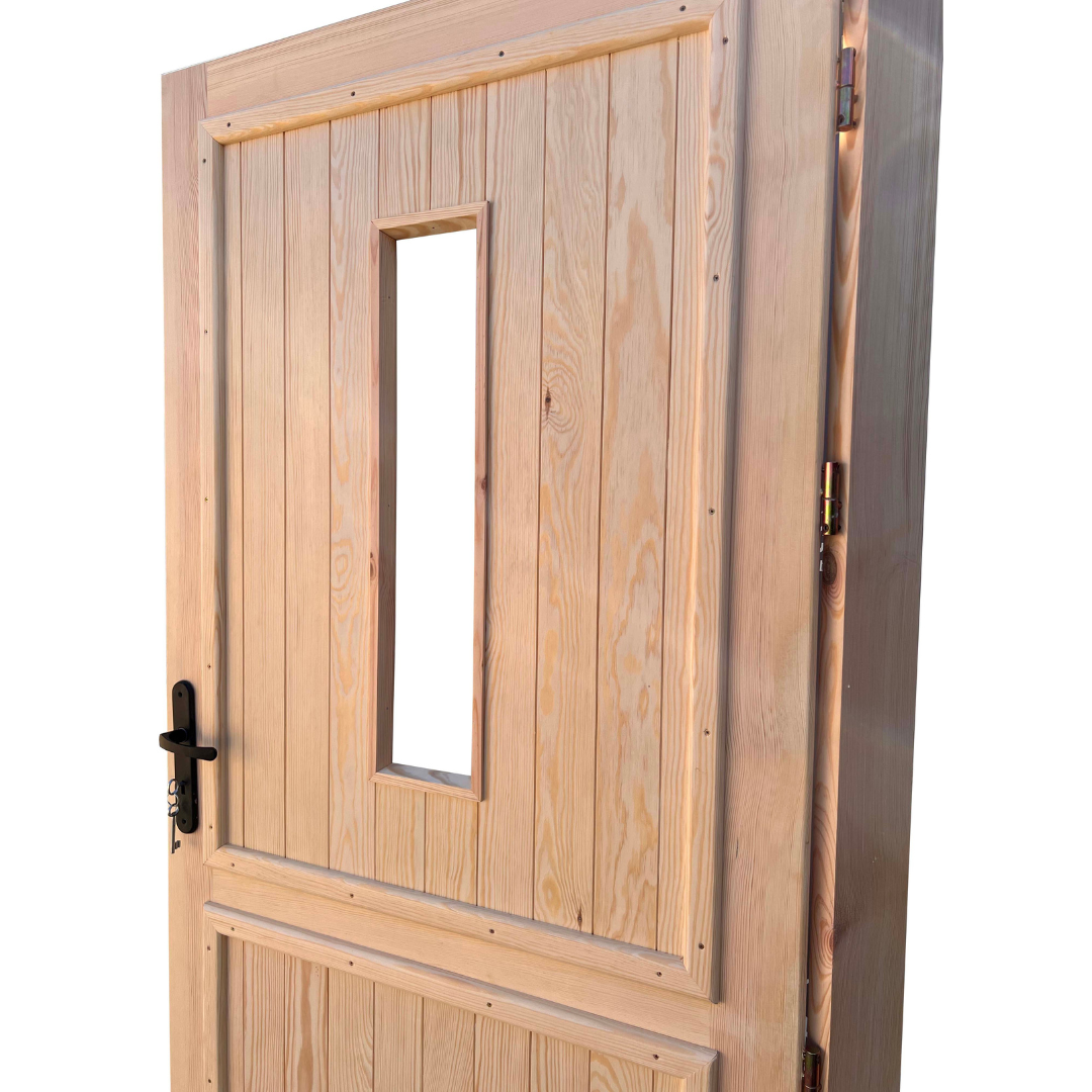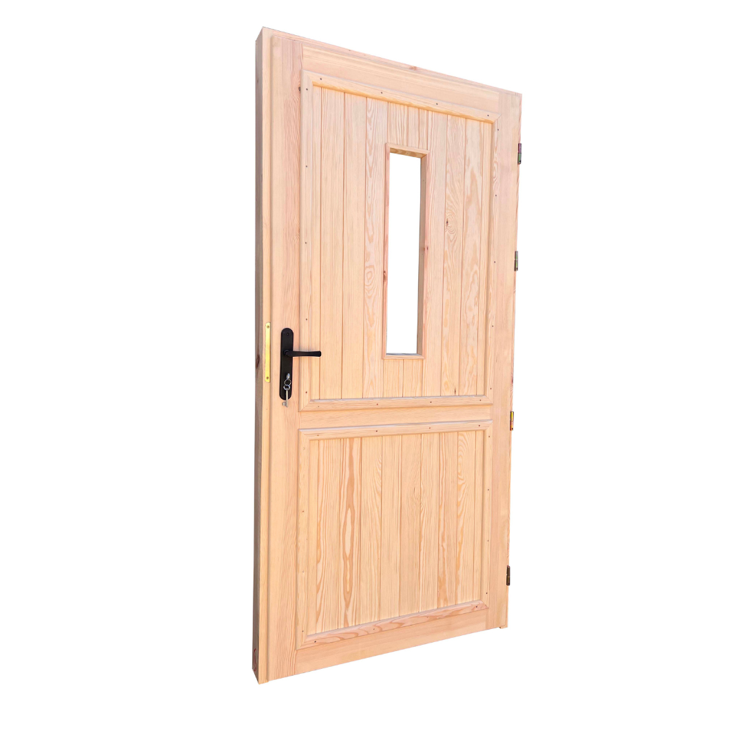 Drzwi są wykonane z drewna sosnowego/świerkowego suszonego komorowo, zaimpregnowane środkiem Fobos M4.