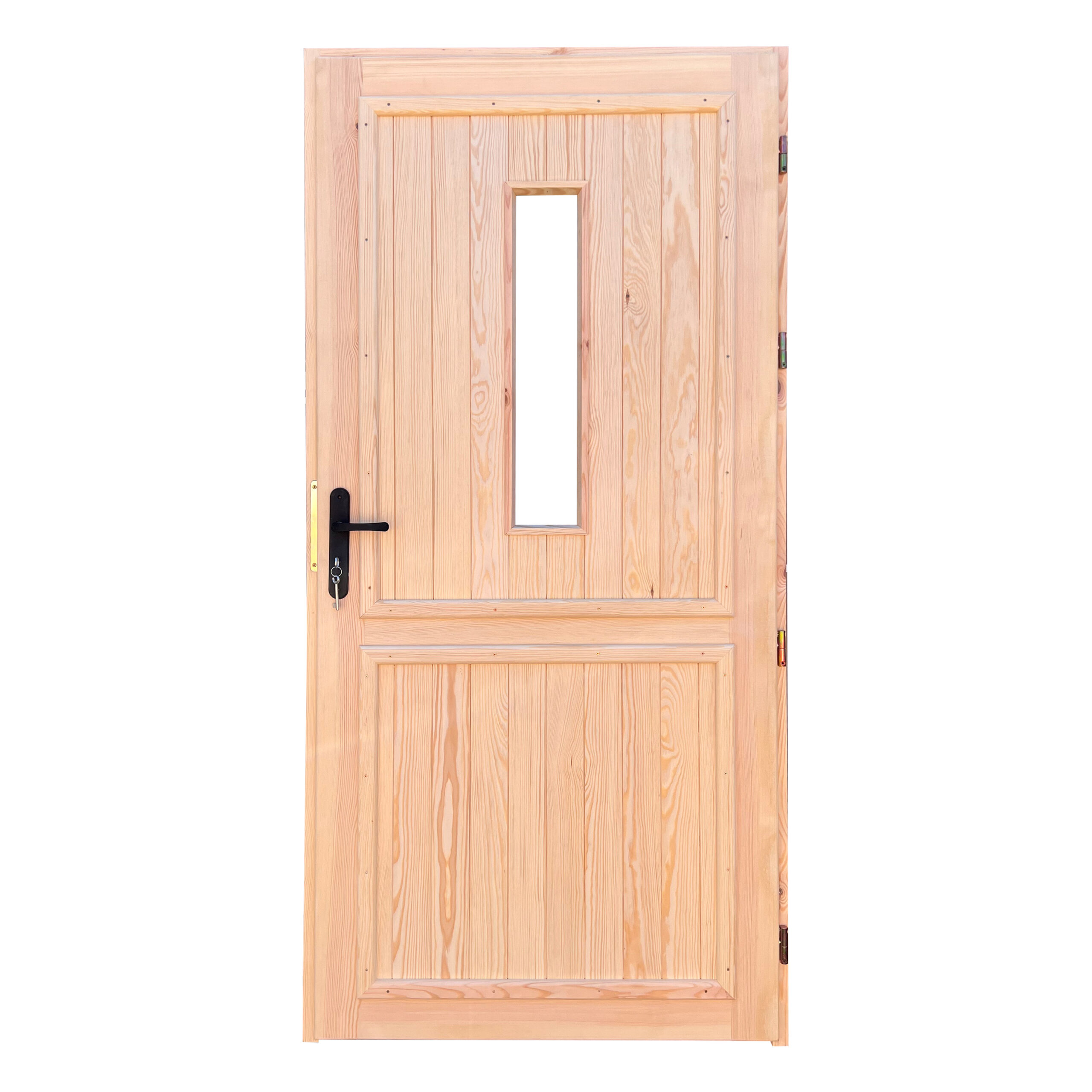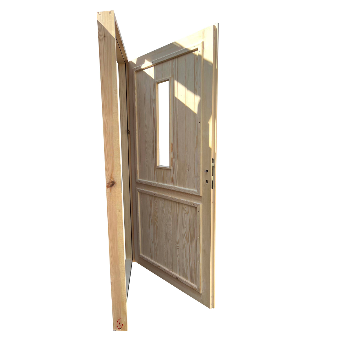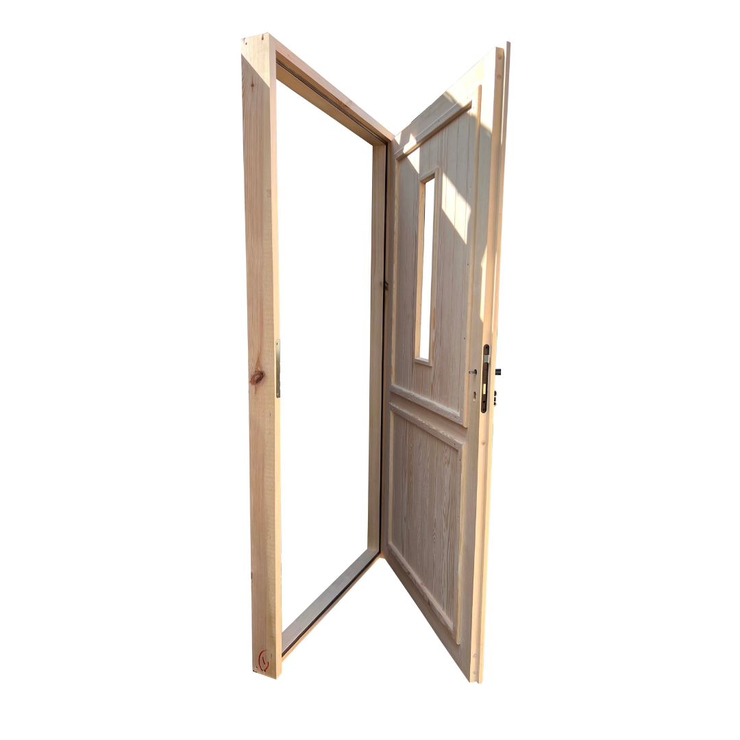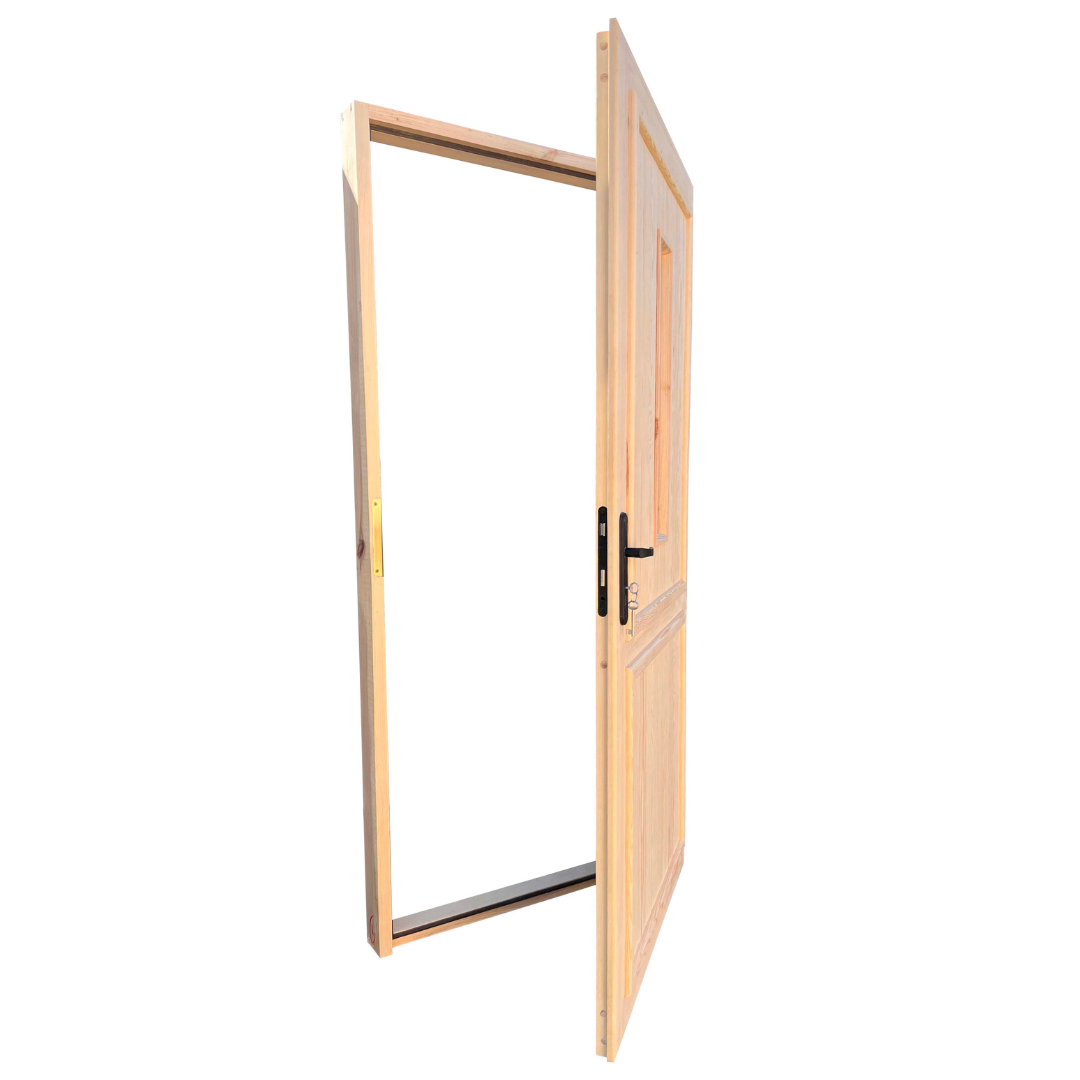 Drzwi są wykonane z drewna sosnowego/świerkowego suszonego komorowo, zaimpregnowane środkiem Fobos M4.